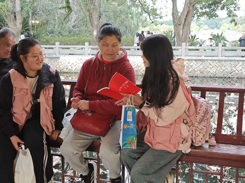 青年志愿者带着视障朋友走进西湖,伴着阵阵菊香健步在公园和栈道上。陈女士说: